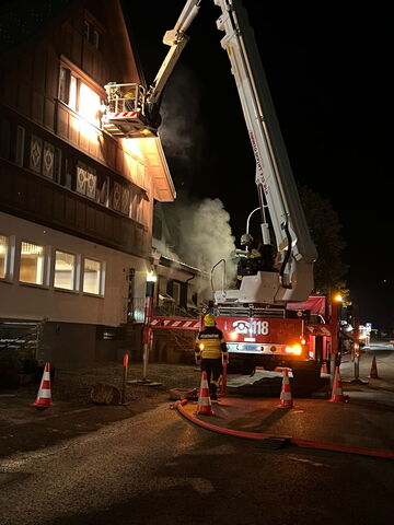 Das Team der Wasserbeschaffung war besorgt, dass das TLF der Feuerwehr Rüte ab Hydrant mit Wasser versorgt wird. Der Hubretter der Stützpunktfeuerwehr wurde gleichzeitig ab Bach mit Wasser versorgt. Zur Sicherung der Nebengebäude, wurde zusätzlich ein Hydroschild mit Wasser ab Bach eingesetzt.